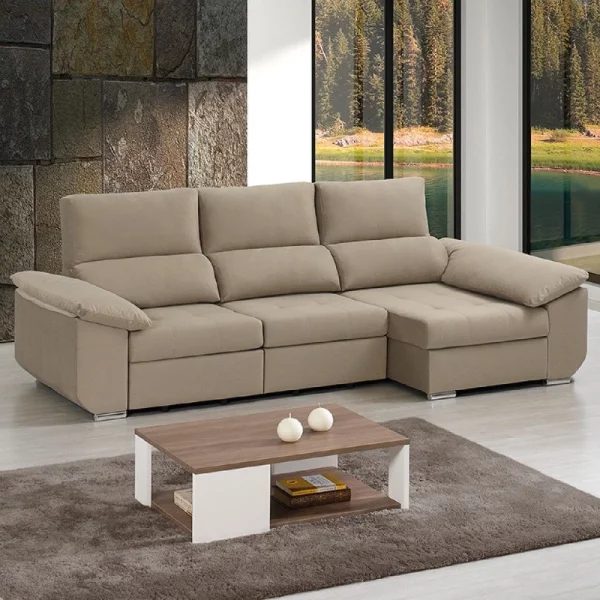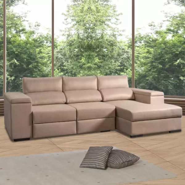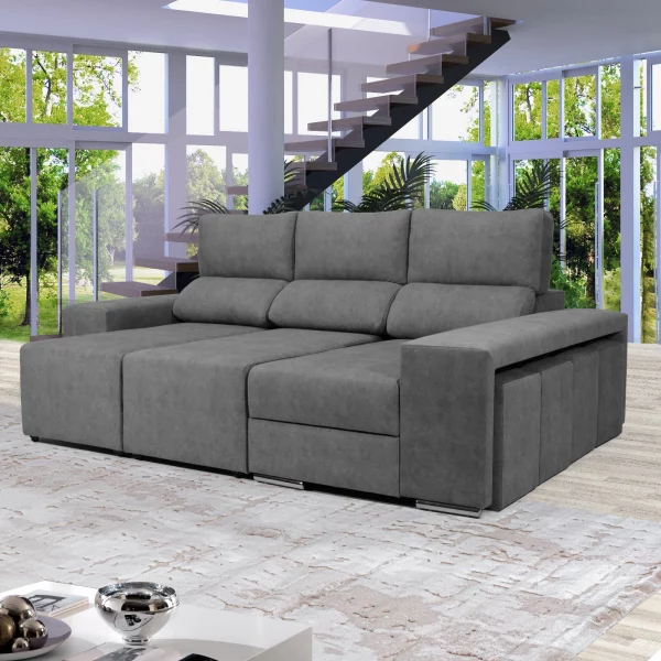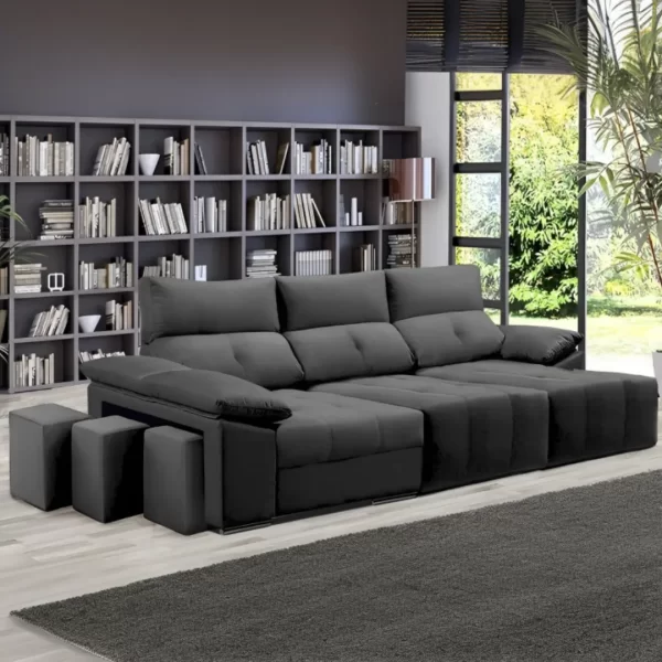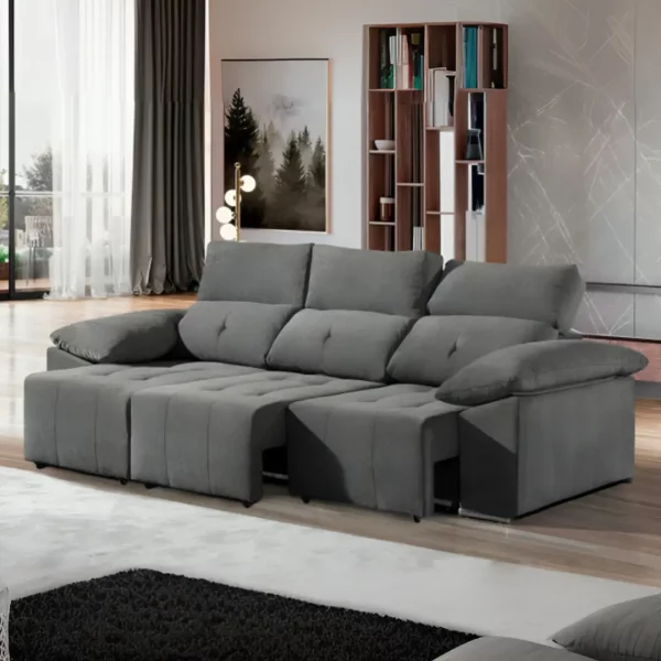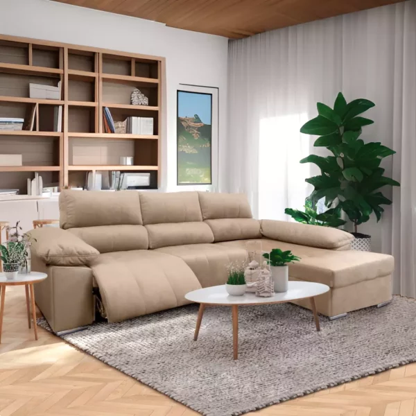 Sofá Chaise Long Saragoça, medida de 270x150cm com assentos deslizantes, encostos reclináveis e espaço de arrumação na chaise. Um sofá que une funcionalidade e estilo para tornar sua sala ainda mais aconchegante.