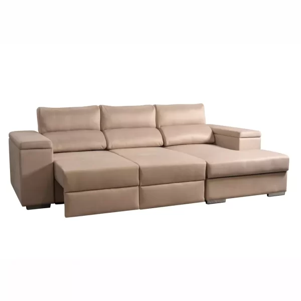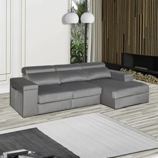 Descubra o sofá Chaise Long Califórnia em tecido de microfibra, com medidas de 270x135cm, encostos reclináveis e baú nos braços. Um sofá que combina design elegante e funcionalidade, oferecendo conforto e a versatilidade de um sofá cama.