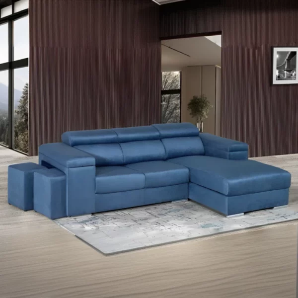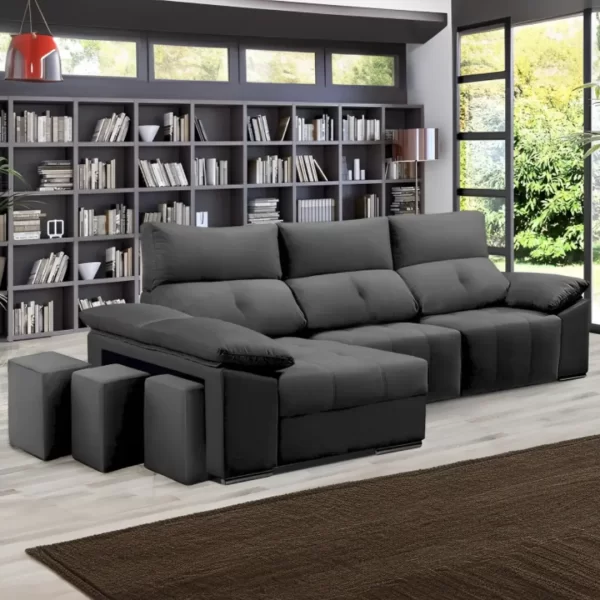 O Sofá Chaise Long Zaire combina um design moderno com praticidade e economia. A chaise reversível permite ajustar facilmente o layout do sofá, adaptando-se a qualquer tipo de sala. Os dois puffs são ideais como apoio para os pés ou assentos extras.