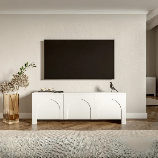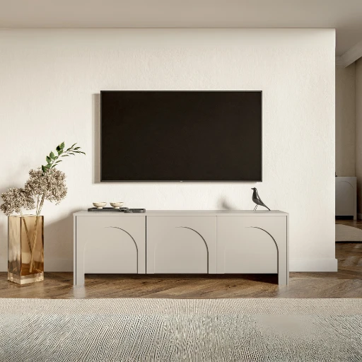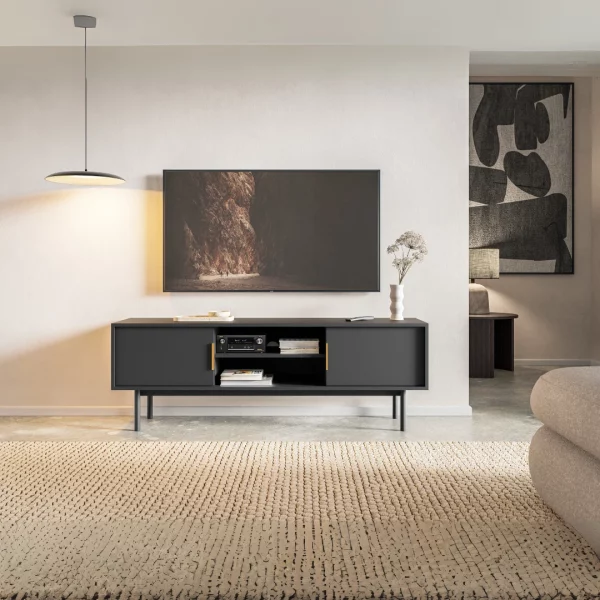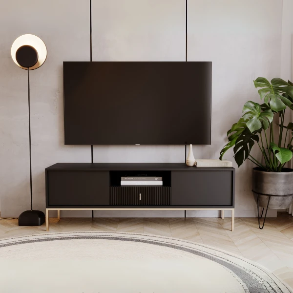 Suporte moderno para televisores até 154 cm, disponível nas cores Preto e Cashmere. Design minimalista com estrutura robusta (154x39x54 cm), ideal para integração em salas contemporâneas.