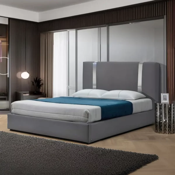 A Cama Halo apresenta um design estofado com uma elegante cabeceira, proporcionando um toque de luxo e estilo para o seu quarto a cabeceira com uma faixa verticais em um tecido especial que imita a elegância de um espelho, adicionando um charme sofisticado e contemporâneo ao seu ambiente.