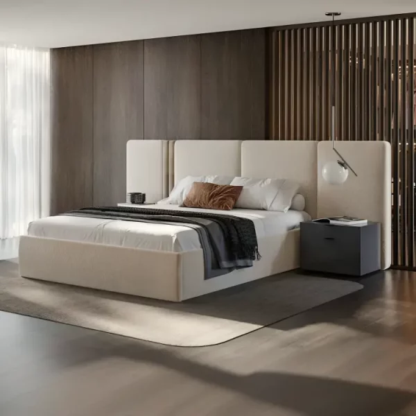 A Cama Link apresenta um design estofado com uma elegante cabeceira, proporcionando um toque de luxo e estilo para o seu quarto a cabeceira com faixas verticais em um tecido especial que imita a elegância de um espelho, adicionando um charme sofisticado e contemporâneo ao seu ambiente.