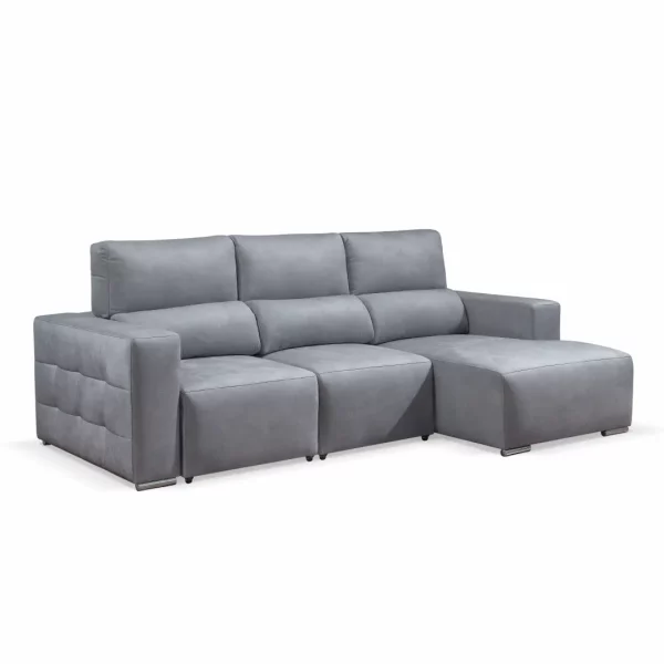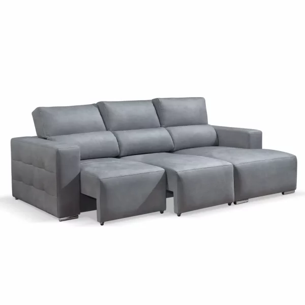 Sofá Chaise Long Saragoça, medida de 270x150cm com assentos deslizantes, encostos reclináveis e espaço de arrumação na chaise. Um sofá que une funcionalidade e estilo para tornar sua sala ainda mais aconchegante.