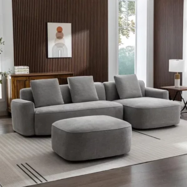 O Sofá Chaise Long Zaire combina um design moderno com praticidade e economia. A chaise reversível permite ajustar facilmente o layout do sofá, adaptando-se a qualquer tipo de sala. Os dois puffs são ideais como apoio para os pés ou assentos extras.