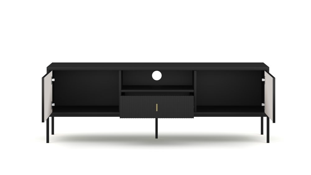 Base de TV moderna disponível em preto, branco ou smoke green, com design clean e funcional.
