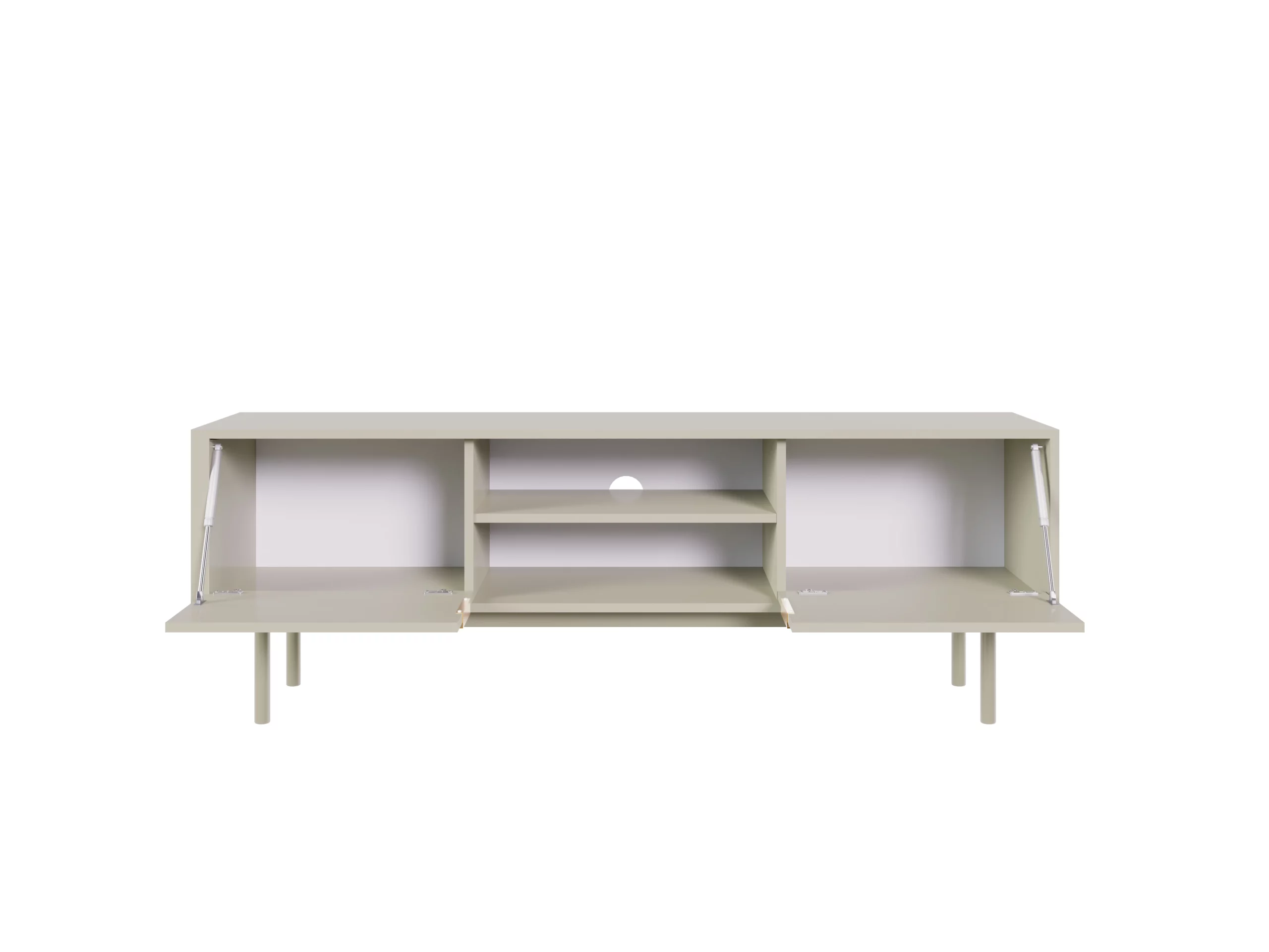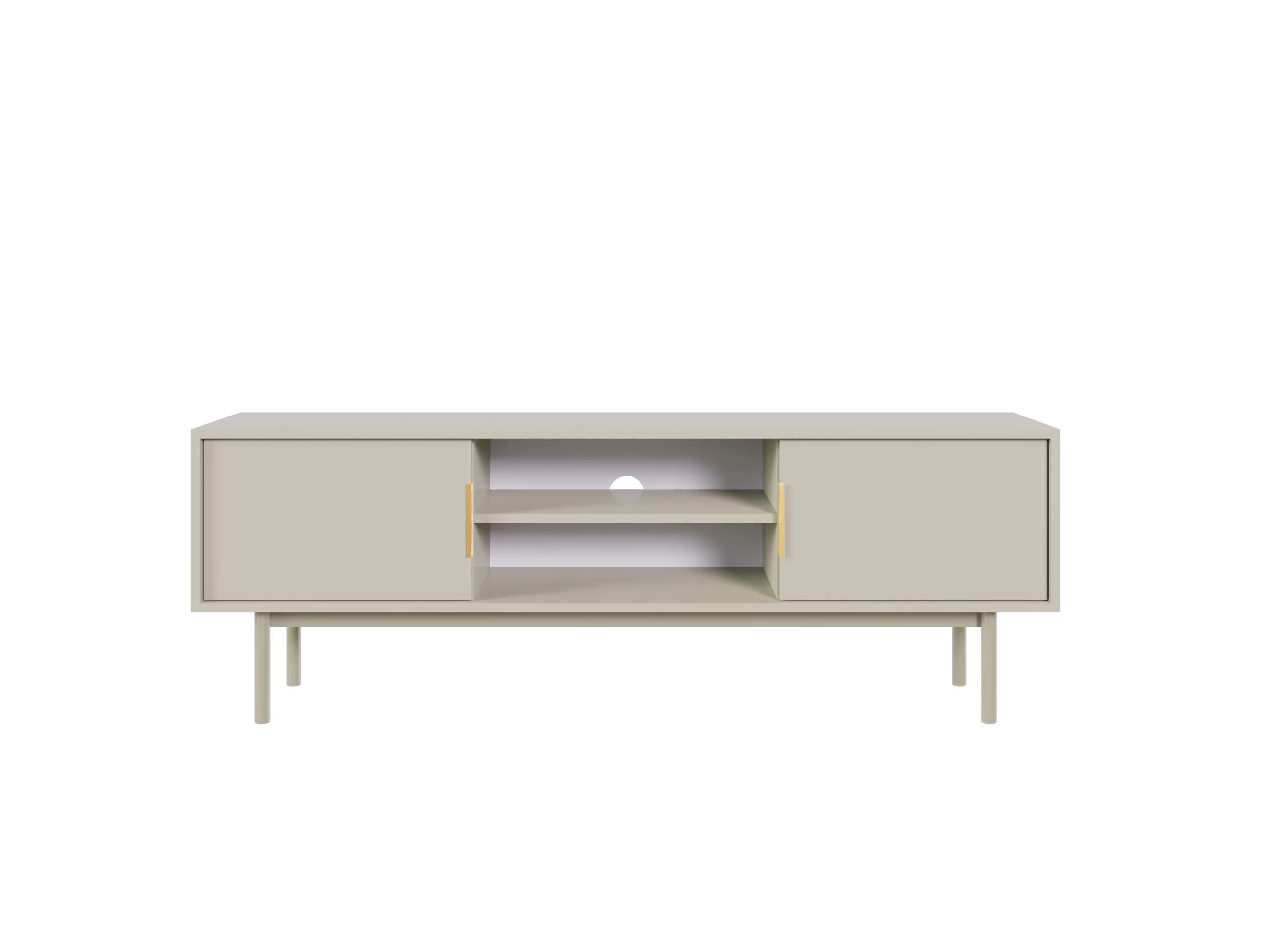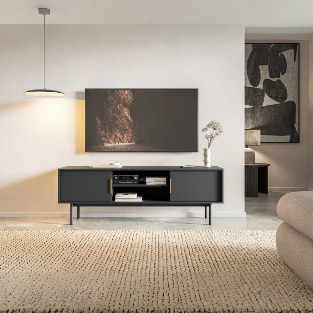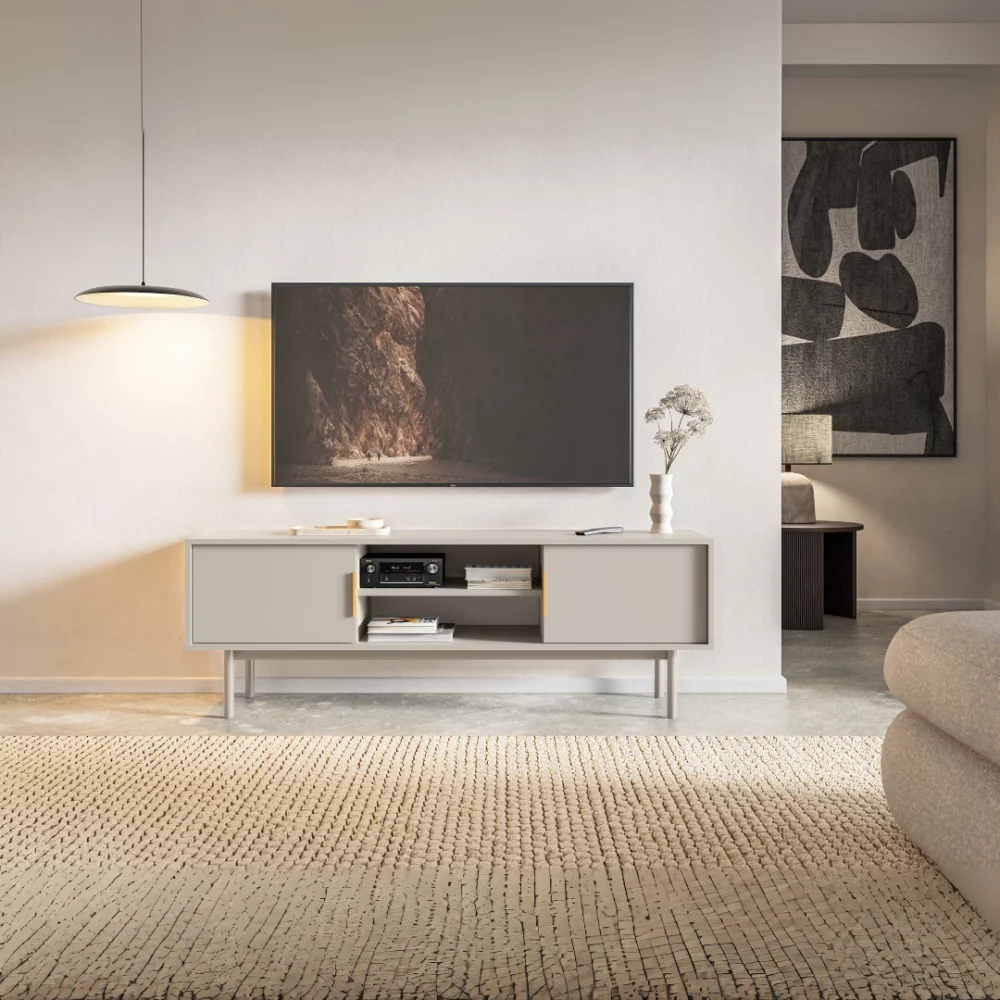 Suporte moderno para televisores até 154 cm, disponível nas cores Preto e Cashmere. Design minimalista com estrutura robusta (154x39x54 cm), ideal para integração em salas contemporâneas.