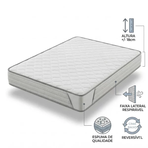 Altura +/- 21cm: Com uma altura ideal de 21cm, este colchão é compatível com a maioria das bases de cama e oferece o suporte necessário para um sono de qualidade.