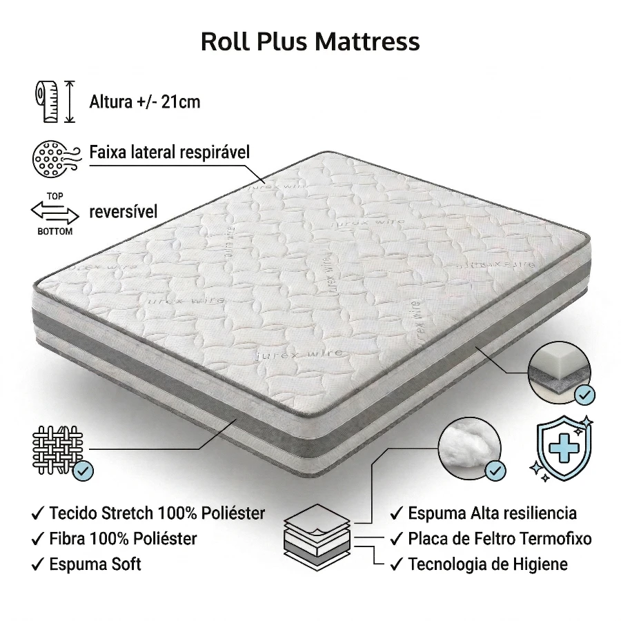 Tecnologia de Higiene Avançada: O Colchão Roll Plus é tratado com Tecnologia de Higiene, que ajuda a proteger contra ácaros, fungos e bactérias, proporcionando um ambiente de sono mais limpo e seguro.