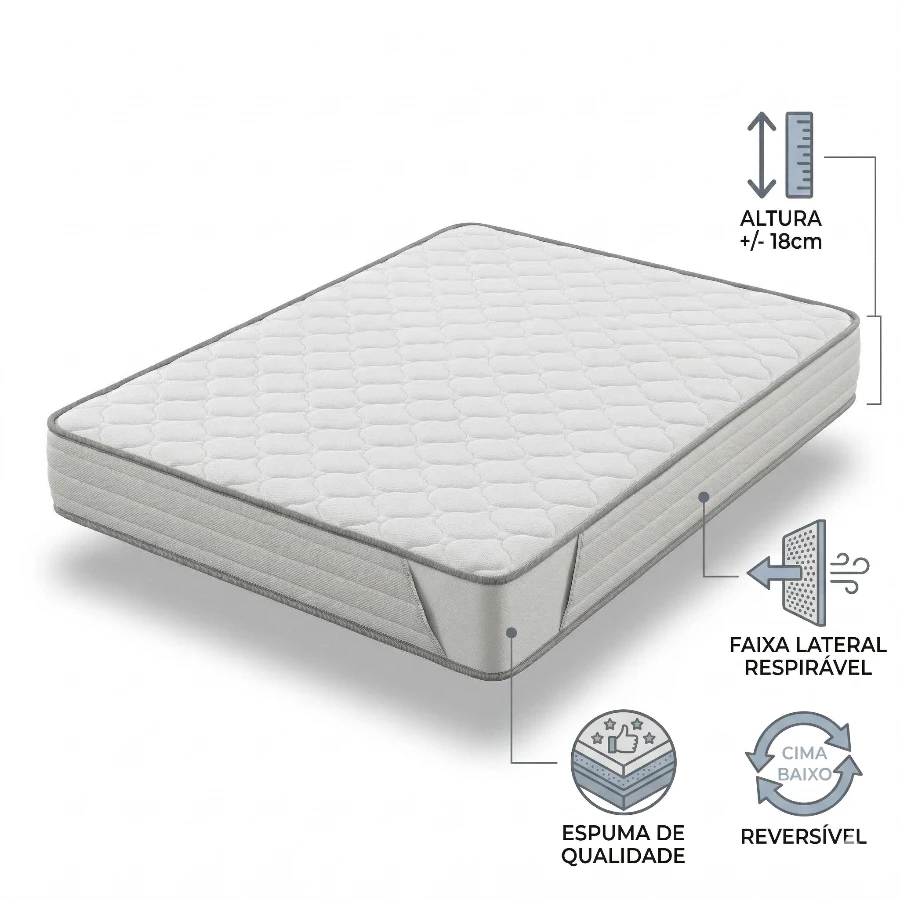 Estrutura em Espuma de Qualidade: A alma do colchão é composta por uma espuma de qualidade, que oferece um suporte firme e uniforme, essencial para o alinhamento correto da coluna durante o descanso básico.
