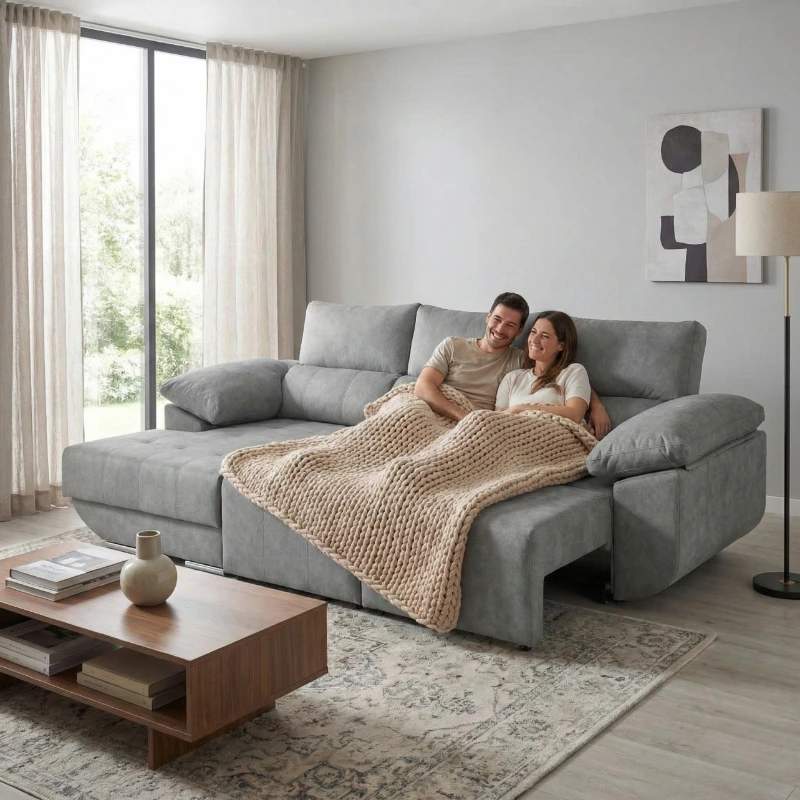 Sofá-cama com cabeços reclináveis e arrumação na chaise. Conforto e funcionalidade para o dia a dia.