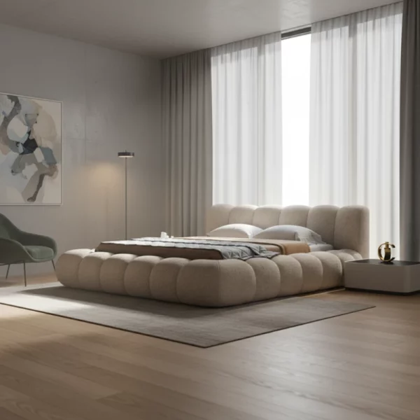 Com acabamento detalhado e visual luxuoso, a Cama Sisma apresenta laterais e cabeceira com gomos acolchoados, criando uma estética moderna e aconchegante. Esse efeito estofado é perfeito para quem valoriza conforto e estilo, sendo o destaque principal da decoração do quarto.