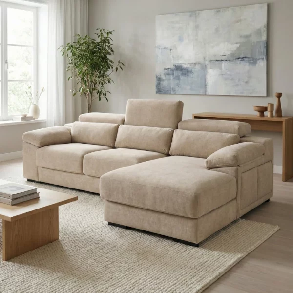 O Sofá Chaise Long Bolzano combina conforto e versatilidade. Assentos extensíveis, cabeços reclináveis e arrumação na chaise. Tecido microfibra de alta qualidade.